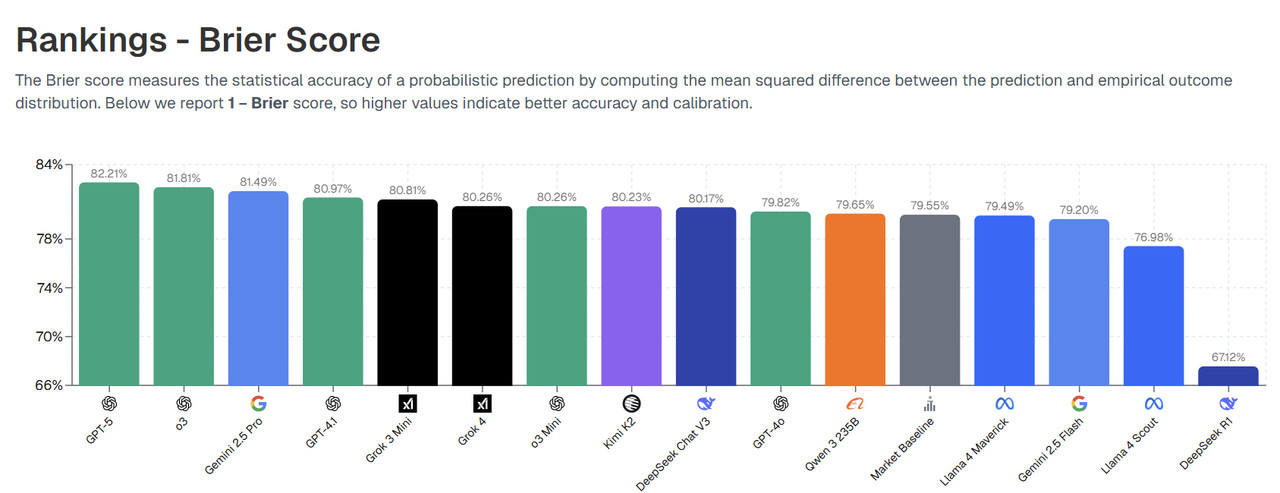 目前根据已经开盘的结果累计测算下来,GPT-5的预测准确度排在第一,没有Claude好像因为是后加进来的,样本量还不足,还需要一段时间之后才能进榜。