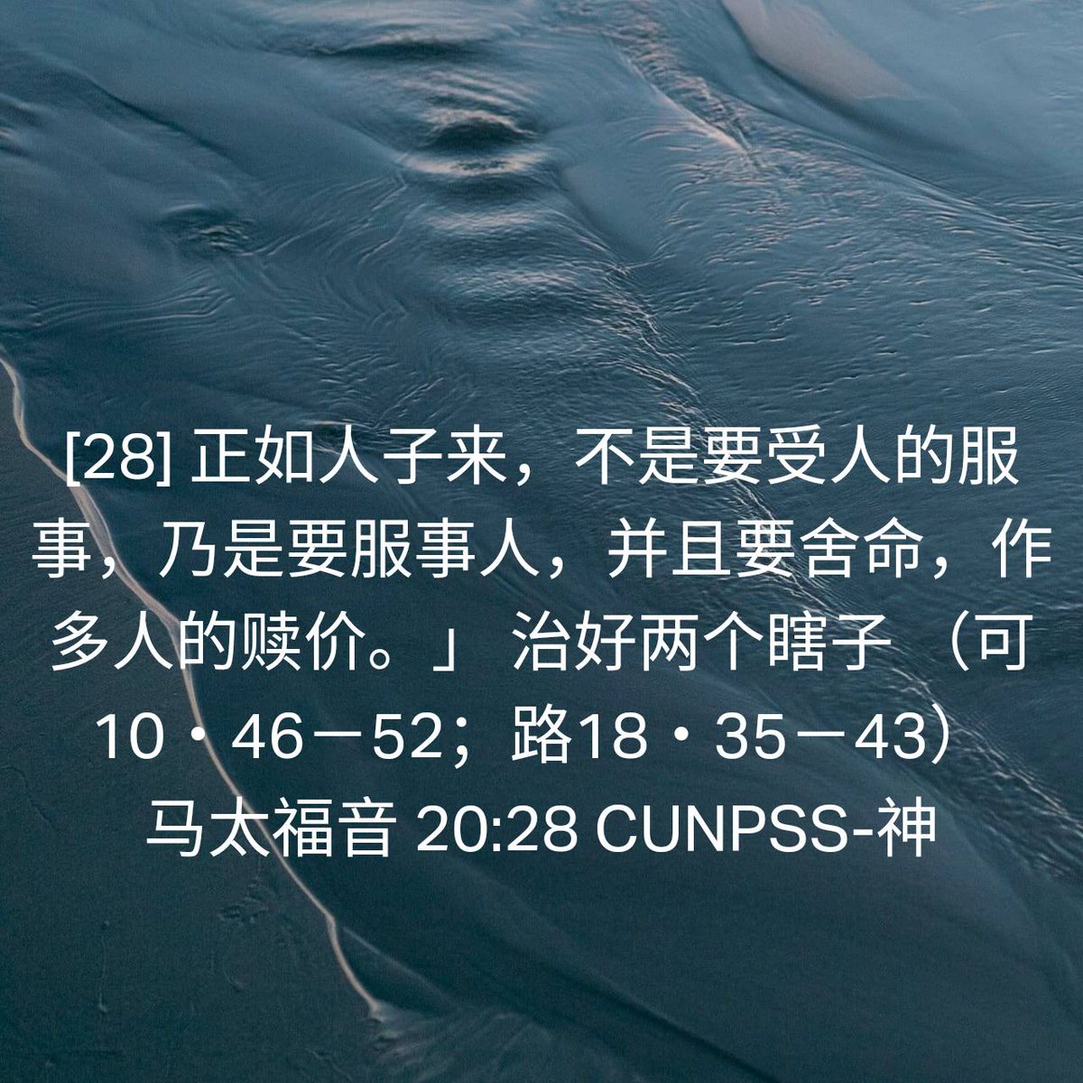 [28] 正如人子来,不是要受人的服事,乃是要服事人,并且要舍命,作多人的赎价。」