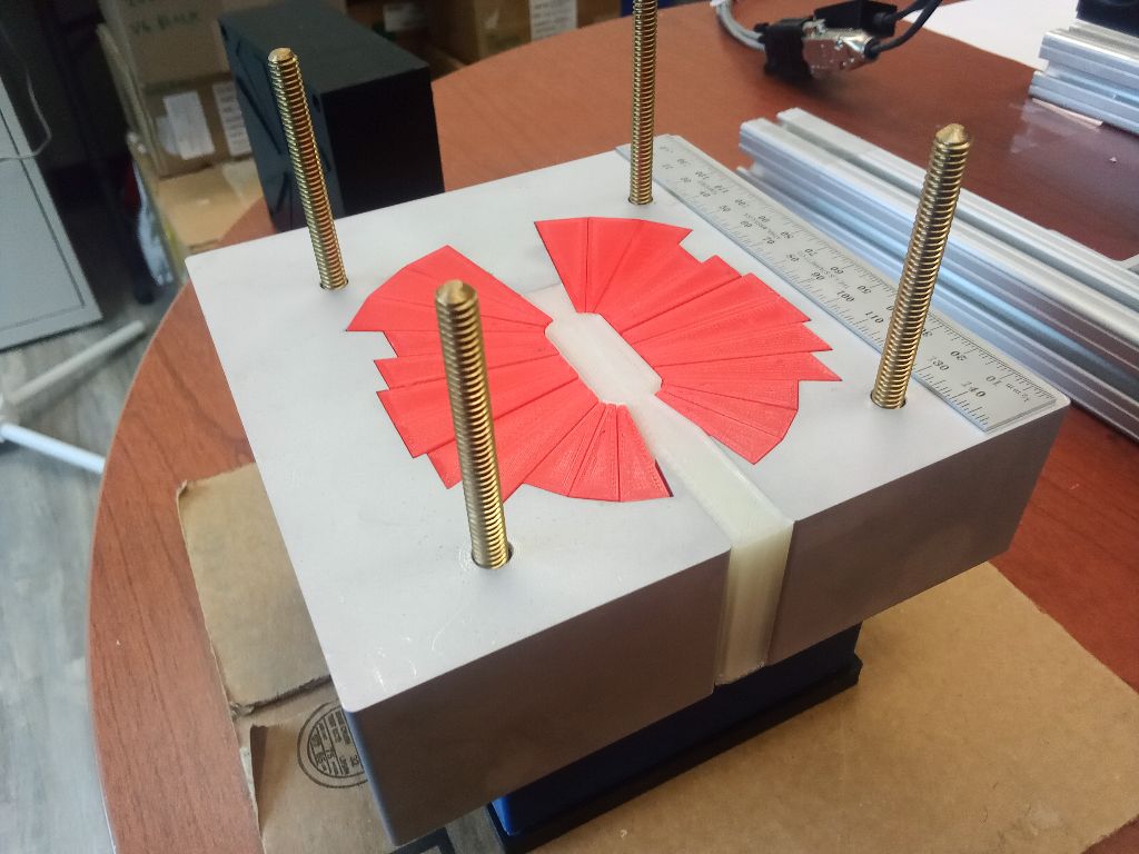 The red central spacer is painted to isolate it from the epoxy; other red blocks are PLA plastic dummies to be replaced by permanet magnets.