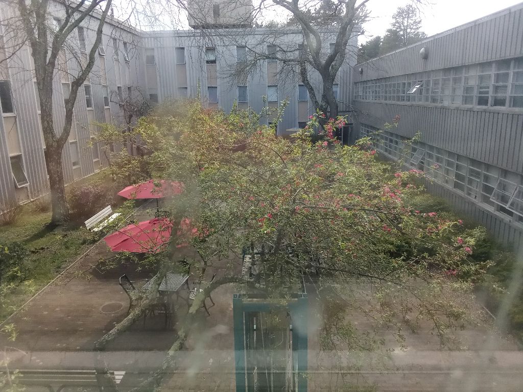 A rabbit is out in front of the house, probably attracted by the large number of dandelions that have grown recently