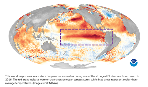 El Niño refers to a climate pattern that arises when the Pacific Ocean's equatorial region experiences warming, which then reacts with the atmosphere to cause weather shifts worldwide.