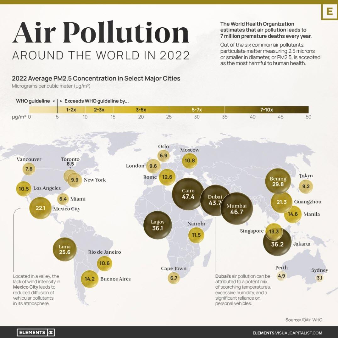 With that context in mind, this visualization from Visual Capitalist's Selin Oğuz and Miranda Smith (https://www.visualcapitalist.com/mapped-air-pollution-levels-around-the-world-2022/) uses IQAir’s World Air Quality Report (https://www.iqair.com/ca/world-air-quality-report) to map out the 2022 average PM2.5 concentrations in select major cities around the globe, expressed in micrograms per cubic meter (μg/m³).