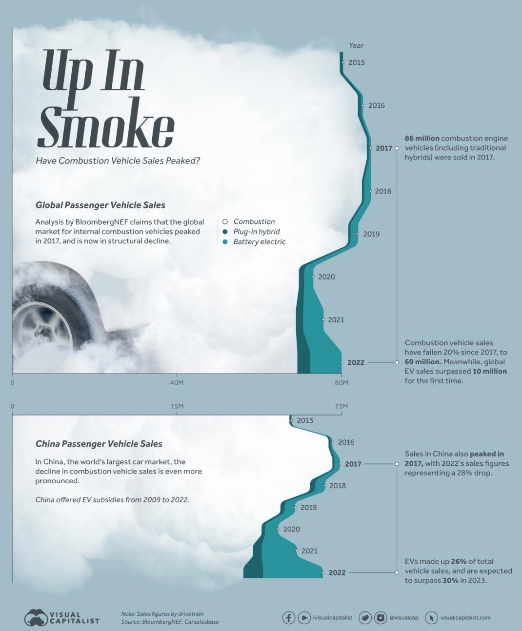 From this, we can see that EVs are definitely building up market share. In fact, combustion vehicle sales appear to have peaked in 2017.