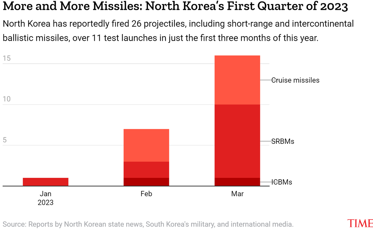 As for Pyongyang's spate of recent missile tests, _Time_ has analyzed missile launch data by North Korea and compared it to last year's (https://time.com/6266737/north-korea-ballistic-missile-tests-2023/):
