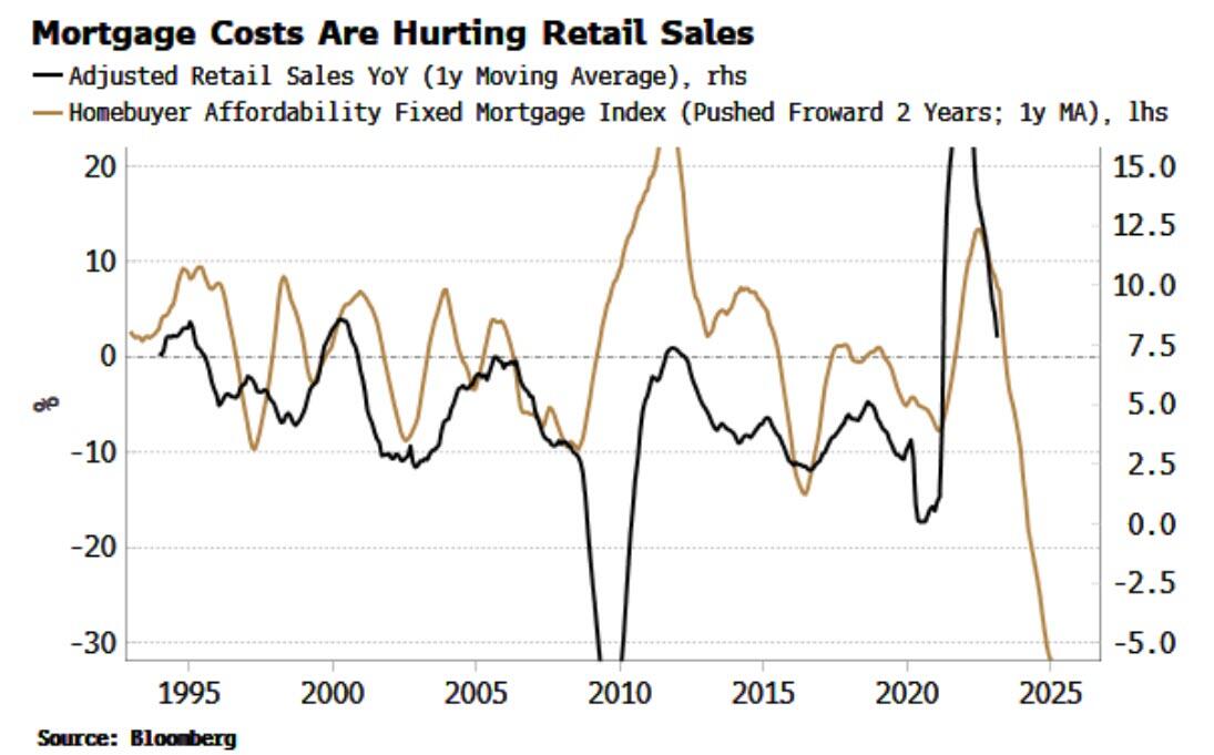 Leading data anticipate that this sharp fall will continue. In the short term, higher-frequency data, such as the weekly Redbook index, points to a weaker retail-sales print today.