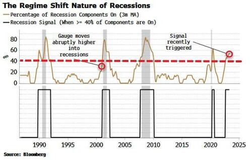 Economies do likewise when they enter a recession. **There is not a steady, linear change between a non-recessionary and recessionary state but a rapid and highly non-linear one.** The historical series of the Recession Gauge captures their suddenness well.