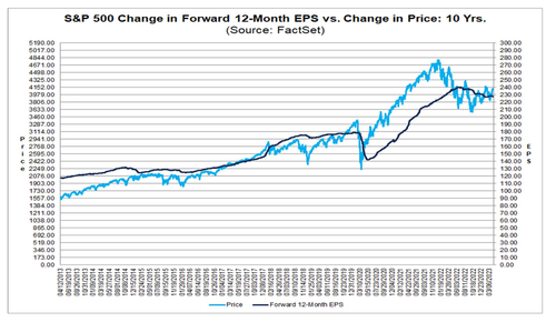 Week after week, starting in December 2022 Morgan Stanley's Mike Wilson was swearing up and down to anyone who listened that _**only he**_ sees just how bad this earnings season will be, and _**only he**_ has a clue how unprepared investors are for the coming carnage. Eventually, his fire and brimstone sermon became so grating and contagious that other banks - such as Goldman - jumped on the bearish board, and eventually consensus S&P expectations did in fact drop, if nowhere near low enough to catch down to Mike Wilson's expectations. But the bottom line from a growing number of analysts and experts was clear: earnings would be terrible and possibly worse.