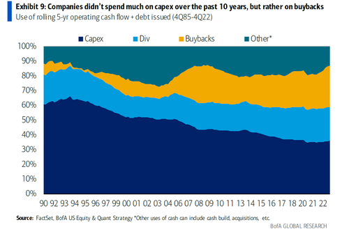 > **Big banks’ solid results (JPM, C, WFC beat on revenue and EPS) despite March’s bank scare helped performance.** JPM saw increased deposits vs. peers declining 3% in 1Q23 but warned on outflows from here. Other non-banks benefited from March’s regional outflows – e.g. mega-cap Blackrock saw $40B+ inflows into cash-management products. Banks may be tightening credit standards, but larger ones are operating with excess capital vs. prior crises. JPM/WFC bought back stock in 1Q and expect to continue in 2023, an increasingly scarce positive amid potentially slowing buybacks in general.