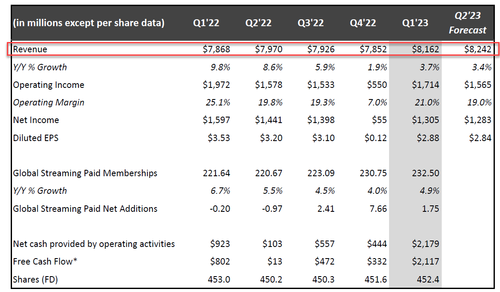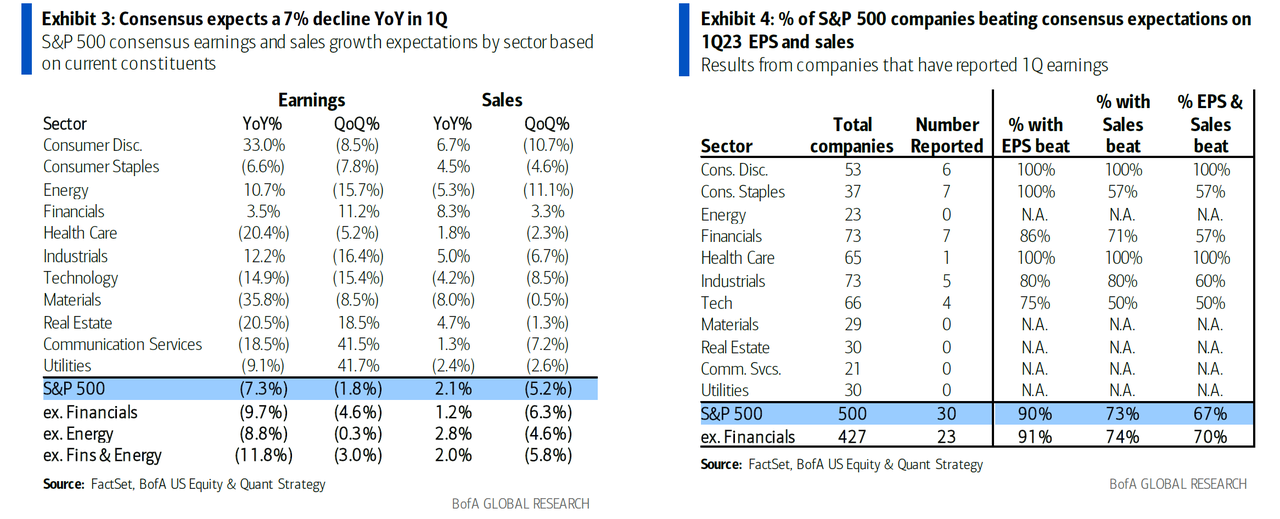 And then something remarkable happened: earnings in the first quarter, the quarter when according to Mike Wilson would see everything crash down (actually he said that about Q4 22 but when it didn't happen he just pushed forward his forecast one quarter up), are coming in much stronger than the morose consensus expects.