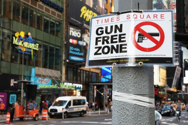 _People walk past a “Gun Free Zone” sign posted on 40th Street and 7th Avenue in New York on Aug. 31, 2022. (Michael M. Santiago/Getty Images)_ (