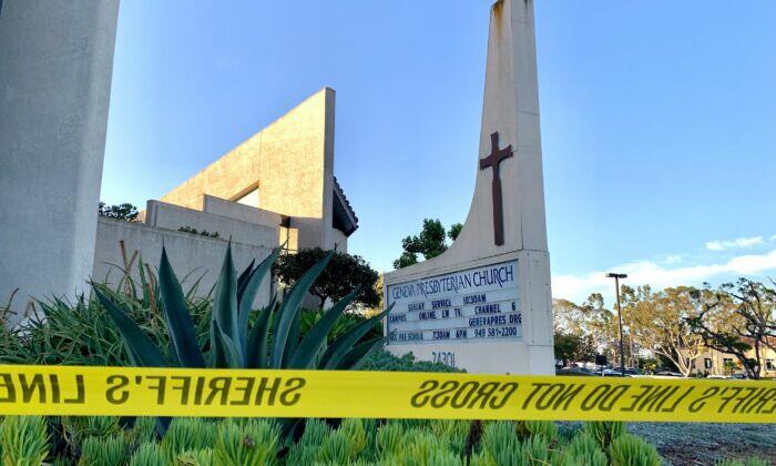 _Police tape at Geneva Presbyterian Church after a shooting left one dead and five injured in Laguna Woods, Calif., on May 15, 2022. (John Fredricks/The Epoch Times)_ (