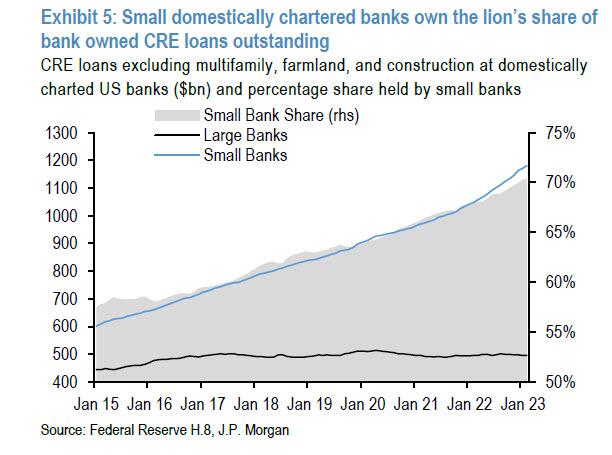 Meanwhile, the collapse of Silicon Valley Bank (and other regional banks) has put a magnifying glass on regional banks, and their CRE loan books remain a significant concern. As shown below, JPM's data as of February 2023, regional banks account for a staggering 70% of total CRE loans outstanding, excluding multifamily, farmland, and construction loans.