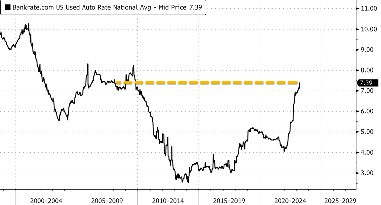 Vehicle financing has become the most challenging in more than a decade. According to Bankrate data, the average rate for a used car has reached 7.39%, the highest level since 2009. High borrowing costs and sky-high used car prices have sparked an affordability crisis.