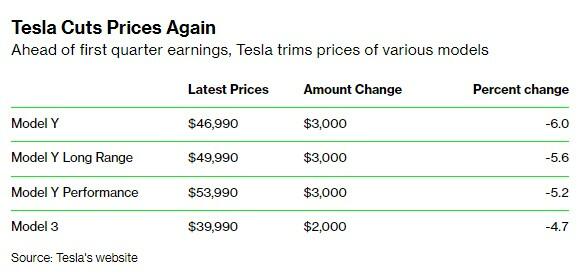 The company cut prices on the Model 3 and Model Y and, as Bloomberg wrote (https://www.bloomberg.com/news/articles/2023-04-19/tesla-drops-model-3-model-y-prices-on-eve-of-quarterly-earnings?utm_source=website&utm_medium=share&utm_campaign=twitter&sref=6uww027M), is likely tipping its hand that it is in the midst of a demand problem. Model Y prices were cut by $3,000 and the base Model 3 was cut by 4.7% to less than $40,000, the report said.