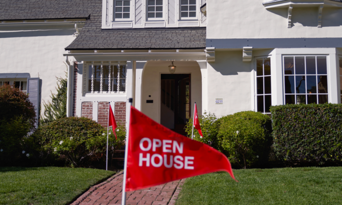 _An 'open house' flag is displayed outside a single family home in Los Angeles on Sept. 22, 2022. (Allison Dinner/Getty Images)_ (