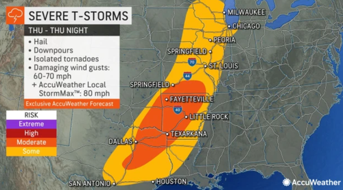 Accuweather meteorologists expect severe storms from northeastern Texas to southern Wisconsin today, including in Chicago, St. Louis, and Little Rock, Arkansas metro areas. They noted more intense storms are expected from southern Missouri to central Texas. The timing of thunderstorms will be later this evening.
