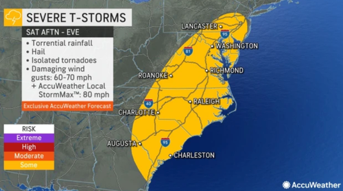 On Saturday, upwards of 30 million people could be at risk of heavy rains and thunderstorms along the Atlantic Seaboard.