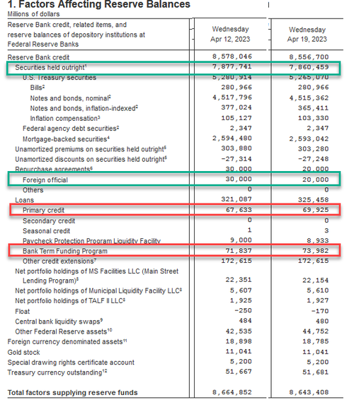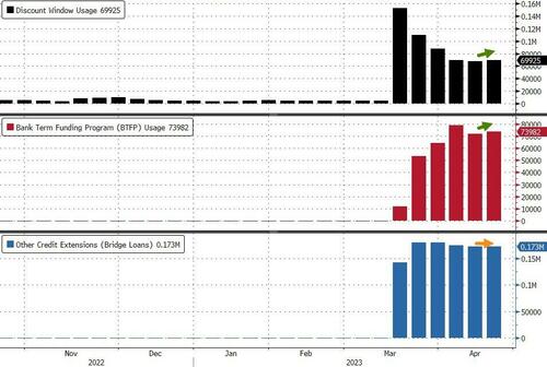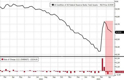 After last week saw The Fed's balance sheet shrink significantly (https://www.zerohedge.com/markets/fed-balance-sheet-shrinks-3rd-straight-week-bank-bailout-facility-usage-eases) back from its bank-bailout resurgence,all eyes will be back on H.4.1. report (https://www.federalreserve.gov/releases/h41/) this evening to see if things have continued to 'improve' or re-worsened amid regional bank shares unable to bounce above post-SVB lows ahead of earnings.