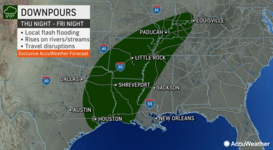 Flash flood threats are posted through Friday for eastern Texas and Louisiana to western Kentucky and southern Indiana.