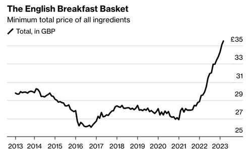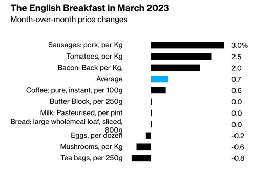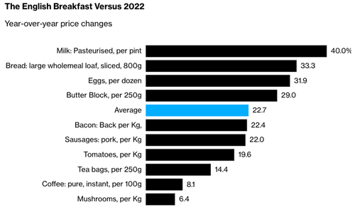 Diving deeper into the report, we find the ingredient costs to make a traditional English breakfast are up a whopping 23% in March from last year. This is the most significant increase since Bloomberg created the Breakfast Index, which tracks prices of sausage, bacon, eggs, bread, butter, tomatoes, mushrooms, milk, tea, and coffee last June.
