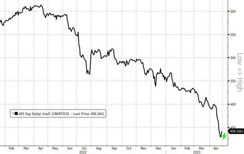 Finally, and ironically, **Argentina’s parallel exchange rate, known as the blue-chip swap, jumped** after Argentina’s Economy Ministry said the **central bank is preparing to dramatically hike its benchmark interest rate by 1,000 basis points** Thursday as a renewed peso selloff in parallel markets piles more pressure on the country’s economic crisis.