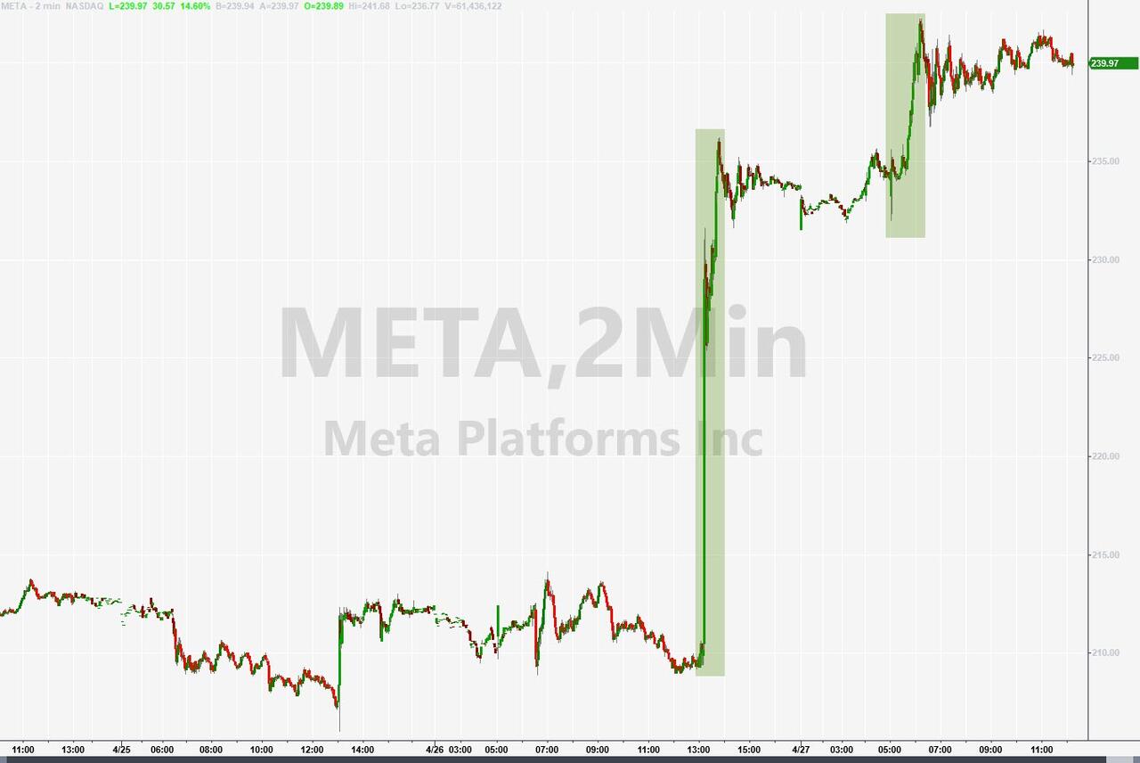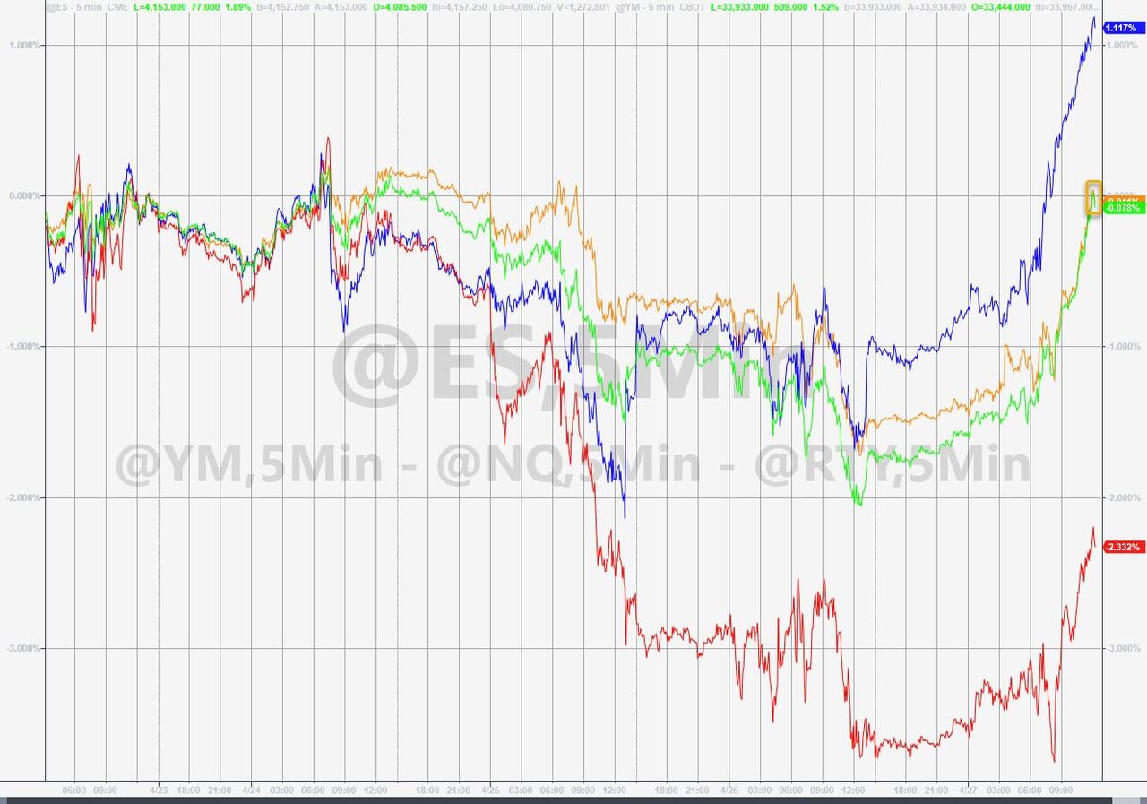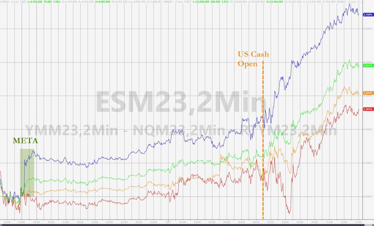 With three out of five FAAMG stocks - which of course is now known as GAMMA ever since Facebook's ignominious rebranding to Meta (at least until the company quietly changes its name to MetAI) - having already reported solid results helping push the market back into the green for the week, investors are keenly looking to Amazon earnings after the close today to (almost) round out the picture for the resurgent market generals while could set the tone for the rest of 2023... or at least until the Fed meeting next week.