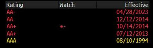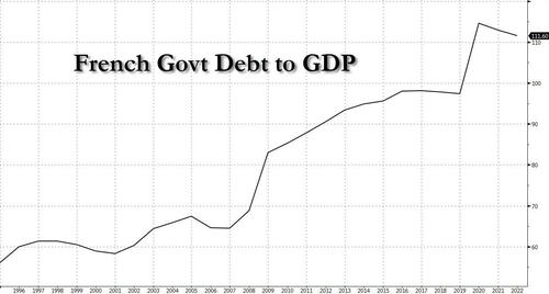 Similar to the US downgrade by S&P in 2011 over the debt ceiling fight, which sparked a witch hunt of the rating agency by minions of the then Treasury Secretary Tim Geithner, the French government was also terribly vexed by this particular case of truthiness about France's economic outlook, and Finance minister Bruno Le Maire, who recently presented the government plan to bring deficits back in line with EU targets by 2027, said France remained committed to structural reforms while explaining why Fitch was wrong.