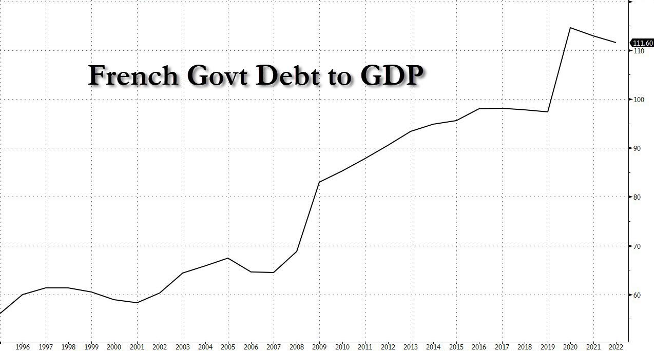 Macron's not-so-secret ambitions for France to supplant AAA-rated Germany as Europe's superpower took a nosedive on Friday when rating agency Fitch downgraded the eurozone’s second-largest economy one notch to AA- (with a stable outlook) late on Friday night over concerns that social unrest and political paralysis following the pensions fight will limit government efforts to improve public finances.