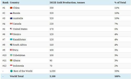 Around **31%** of the world’s gold production in 2022 came from three countries—China, Russia, and Australia, with each producing over **300 tonnes** of the precious metal.