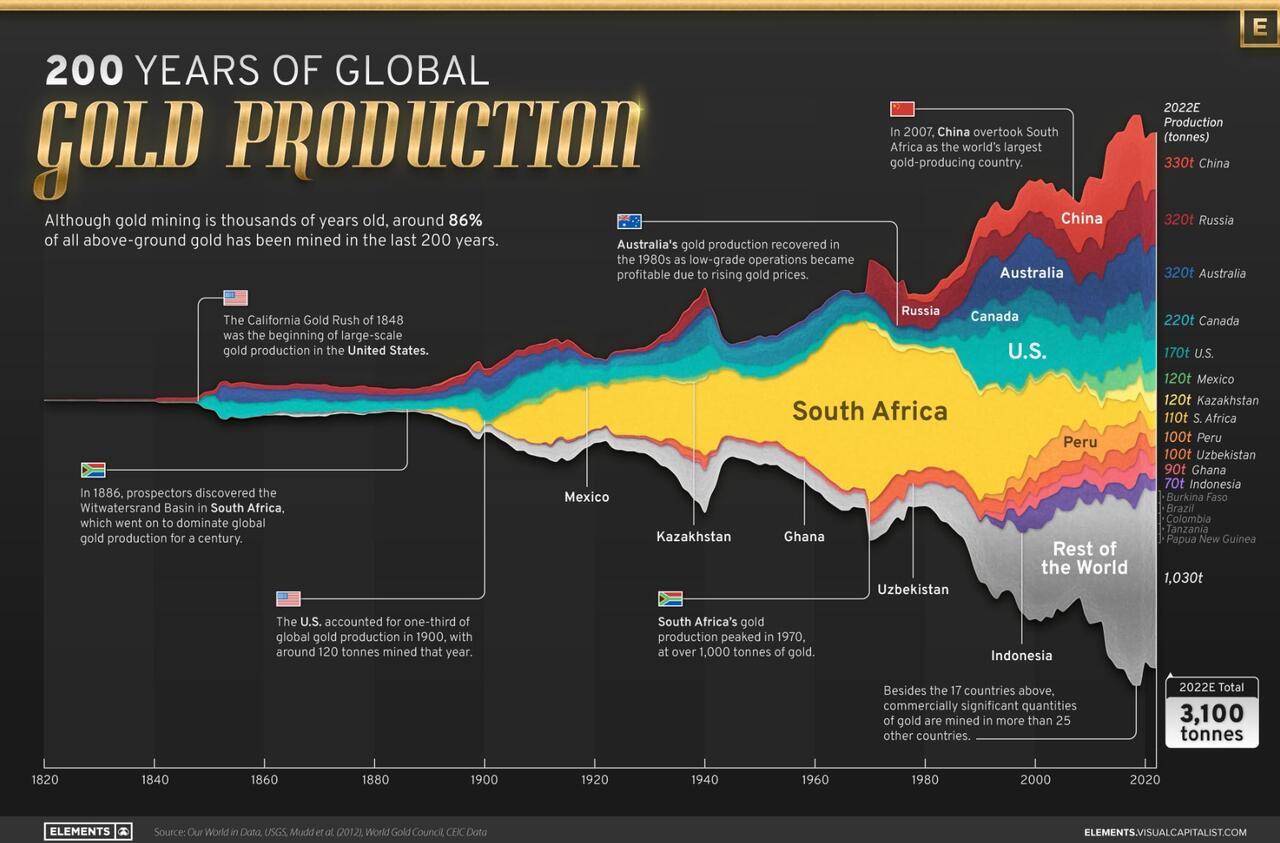 In the infographic below, Visual Capitalist (https://elements.visualcapitalist.com/200-years-of-global-gold-production-by-country/)'s Govind Bhutada and Miranda Smith, (https://elements.visualcapitalist.com/200-years-of-global-gold-production-by-country/)using data from Our World in Data (https://ourworldindata.org/grapher/gold-production), visualizes global gold production by country from 1820 to 2022, showing how gold mining has evolved to become increasingly global over time.