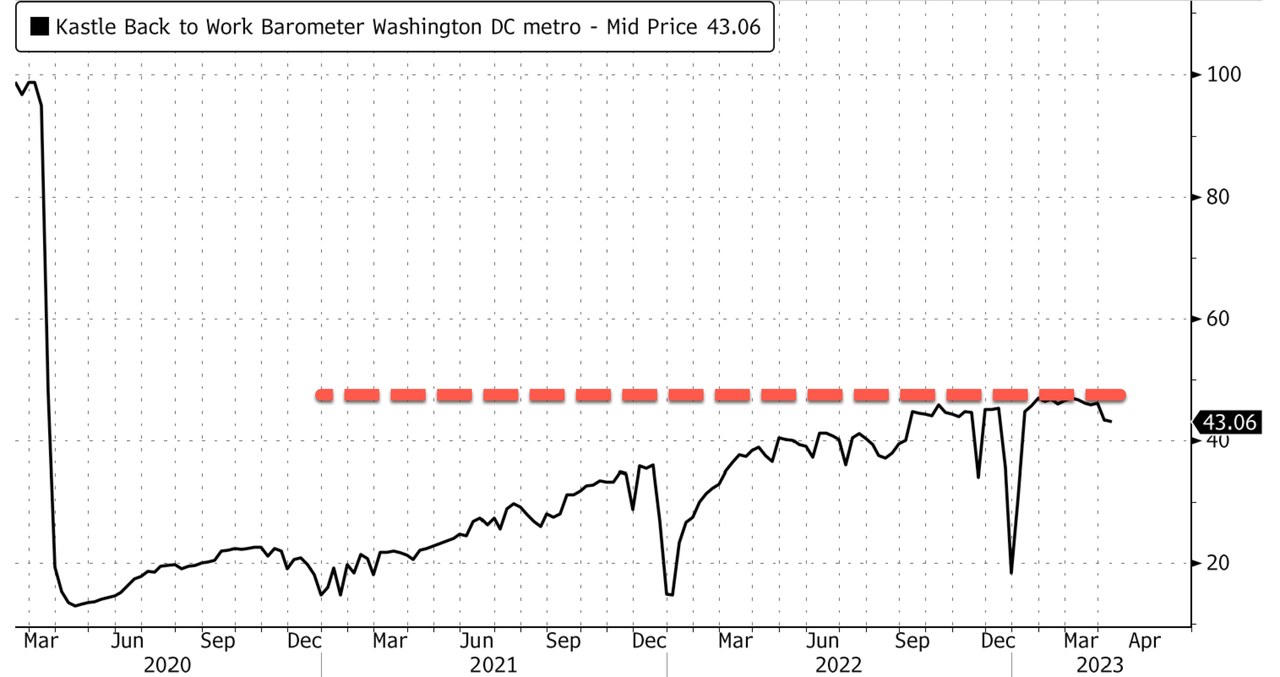 The gold-standard measure of office occupancy trends is the card-swipe data provided by Kastle Systems. The average office occupancy nationwide is around 46%, still well off the highs from pre-pandemic levels.