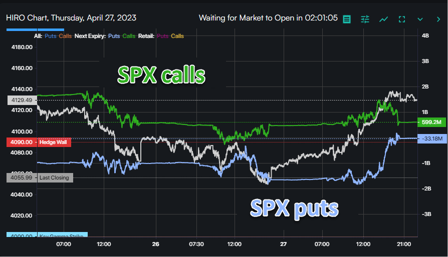 Let’s take a look at the first three trading days of the VIX1D. First, on Tuesday, April 25th, call selling weighed down on the market, as indicated by the green line while the puts were not impactful. Then, on Wednesday, puts were more in control, leading the market up in the morning and then back down in the afternoon. Lastly, starting with some call buying and then put selling for a doubly bullish lift on the index price, the market trended higher. You can see the meaningful impact of the 0DTE tool throughout these three days.