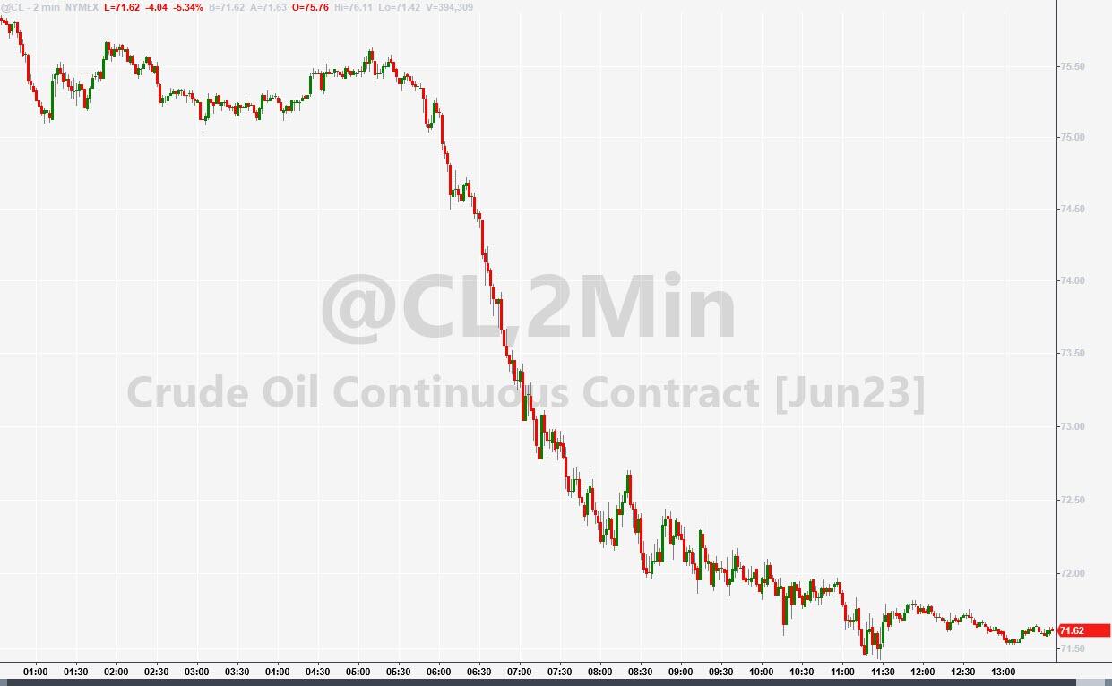 Oil prices cratered today - their biggest drop since the start of January - amid low liquidity and dismal macro data.