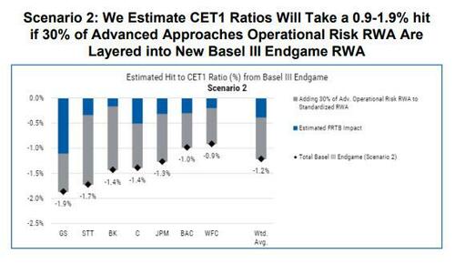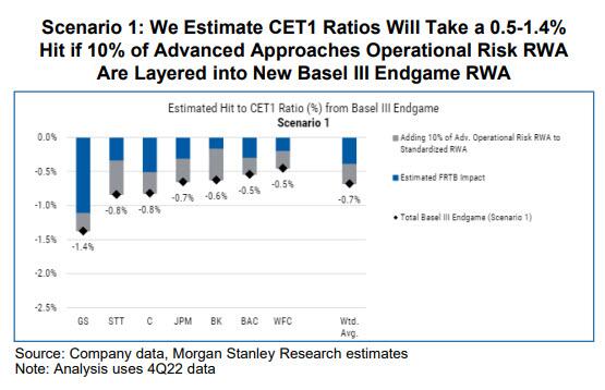 ... **and by 1.2% (range 0.9-1.9%) in a tougher “Scenario 2.”**(for more please see " _Basel III Endgame is Coming... Get Ready for Tougher Capital Requirements (https://www.dropbox.com/s/a7ss7kab26l85aj/MS%20Basel%20III%20Endgame%20is%20Coming...%20Get%20Ready%20for%20Tougher%20Capital%20Requirements.pdf?dl=0)_" available to professional subscribers).