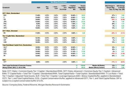 Bottom line: MS estimates some $153B of excess capital across the group vs. regulatory minimums as of 1Q23. Commentary from this earnings season suggests that managements are shifting into capital build mode as macro risk rises and as regulators are expected to impose tougher capital requirements on the industry.