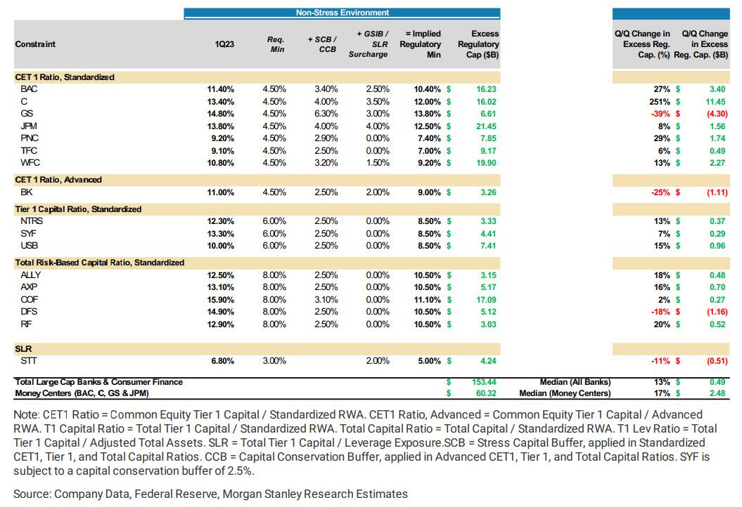For more see "How Much Excess Capital Do Banks Have (https://www.dropbox.com/s/1w40zp3va4xn1e2/MS%20-%20How%20Much%20Excess%20Capital%20Do%20Banks%20Have.pdf?dl=0)?"