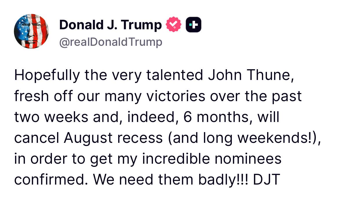 Trump solicita que John Thune cancele o recesso de agosto para acelerar a confirmação de indicados incríveis no governo.