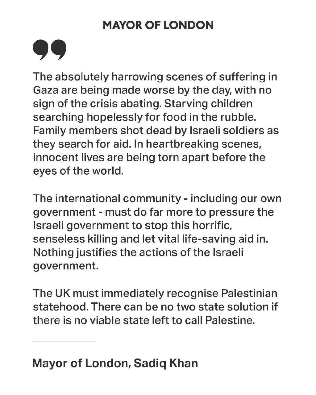 Sadiq Khan, prefeito de Londres, afirmou que o Reino Unido deve reconhecer imediatamente a soberania do Estado da Palestina.