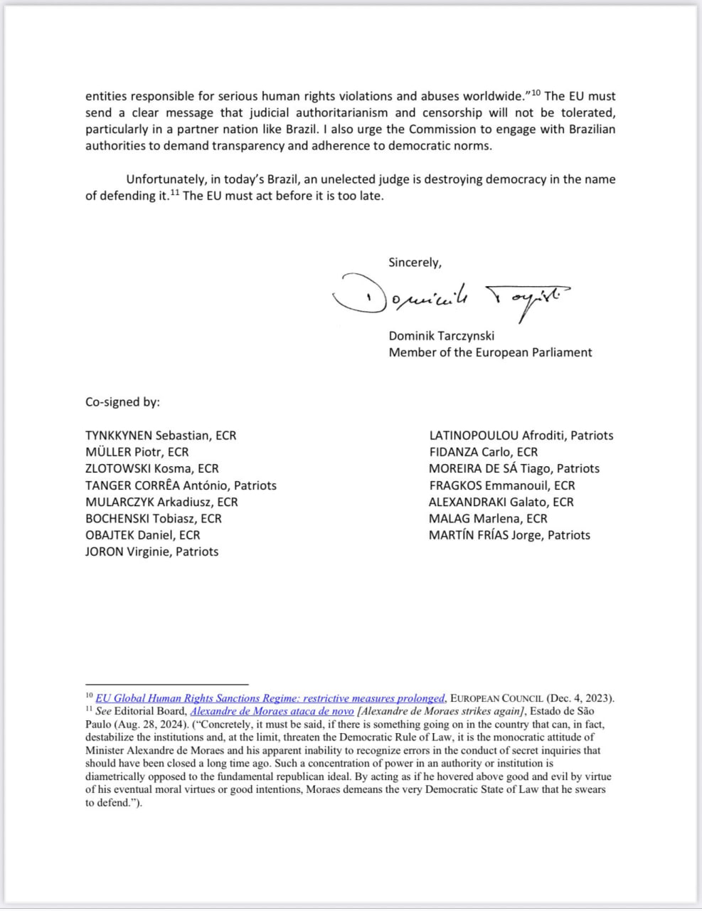16 eurodeputados pedem à UE sanções contra Alexandre de Moraes por supostas violações de direitos humanos. Alegam que ele atua como investigador, promotor e juiz em casos contra opositores, incluindo Bolsonaro.