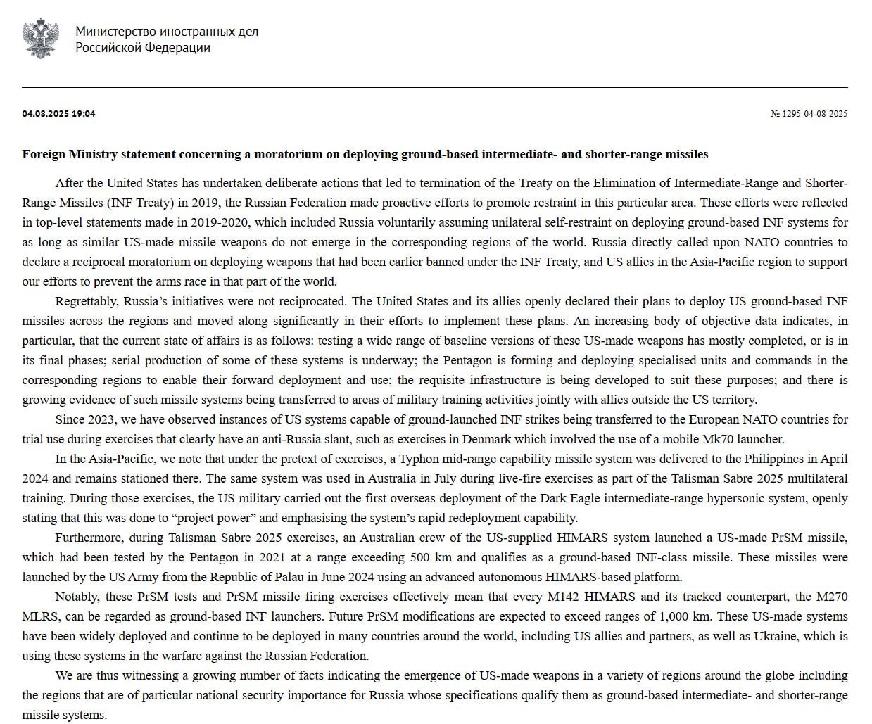 Ministério das Relações Exteriores da Rússia anuncia que Forças Armadas não seguirão mais restrições do Tratado INF, que proibia mísseis de alcance entre 500 e 5.500 km. EUA suspenderam participação em 2019.