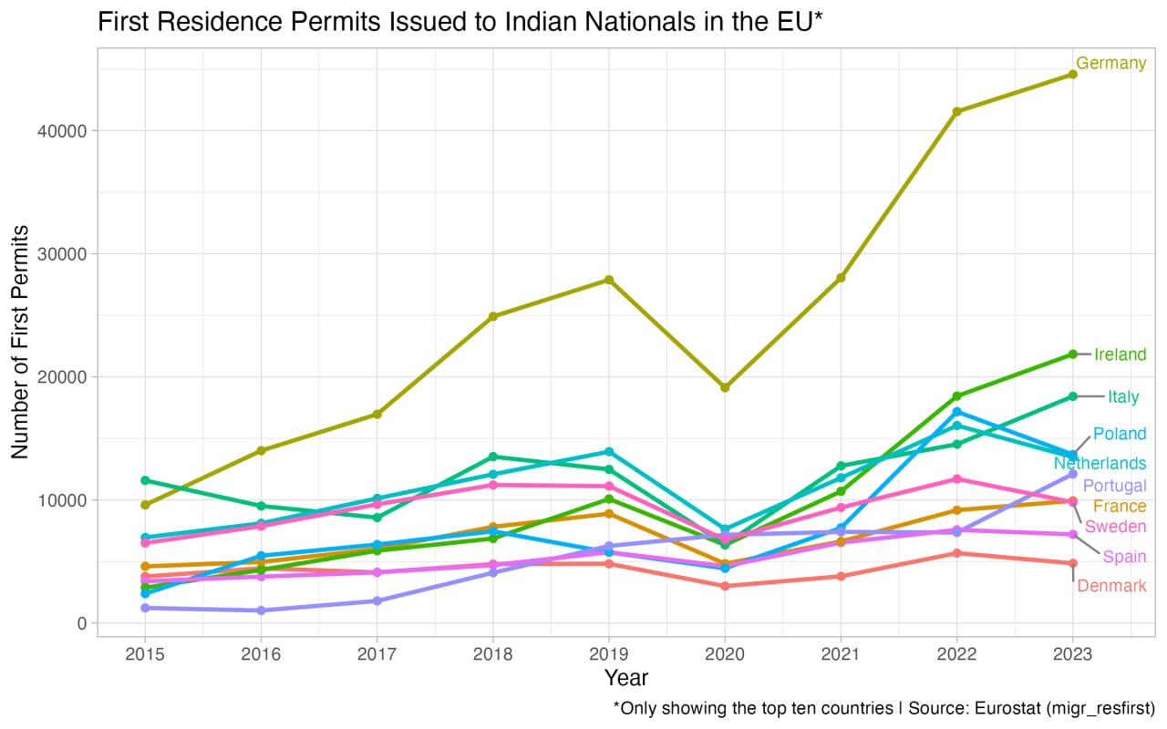 Em 2023, a Irlanda concedeu o segundo maior número de permissões de residência para cidadãos indianos na União Europeia.