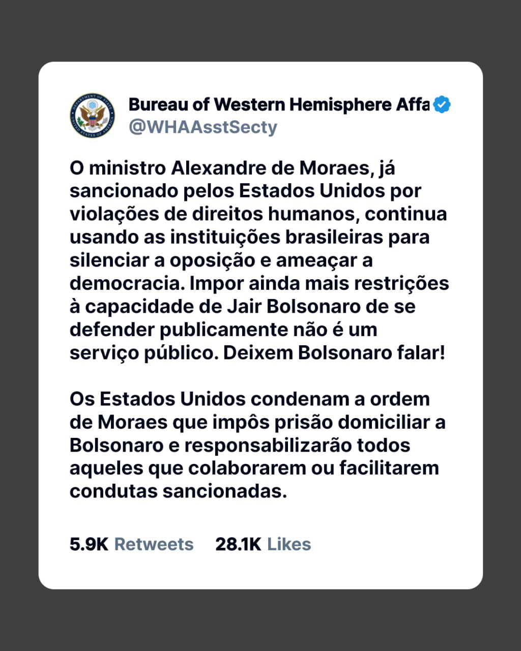 EUA condenam ordem de prisão do STF contra Bolsonaro e afirmam que responsabilizarão apoiadores de ações do ex-presidente sobre violações de direitos humanos. Ministro Moraes sofre sanções americanas.