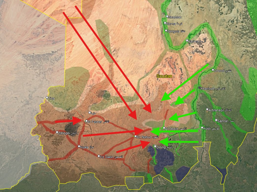 79 aviões desembarcaram homens e material no aeroporto Matan al-Sarra, renovado pelo Corpo Africano Russo. Forças capturaram a fronteira noroeste do Sudão com ajuda da Líbia, mirando El Fasher e El Obeid.