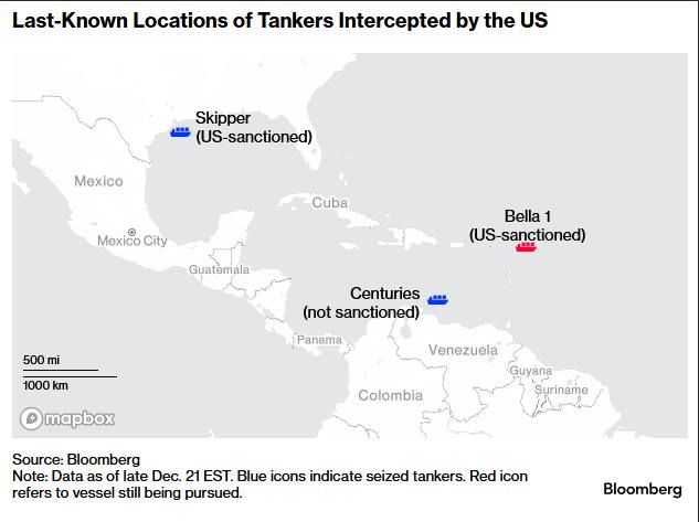 Mapa mostra interceptação de petroleiros pelos EUA, com ícones azuis indicando navios apreendidos e vermelho sinalizando "Bella 1" sob perseguição em 21 de dezembro. Relatos não confirmados sugerem fuga do "Bella 1". Operações visam frota fantasma iraniana que transporta petróleo venezuelano.