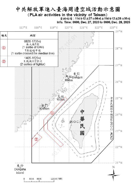 Ministério da Defesa de Taiwan detectou três aeronaves e sete navios chineses operando ao redor da ilha. Três aeronaves cruzaram a linha mediana e entraram na zona de identificação de defesa aérea de Taiwan.
