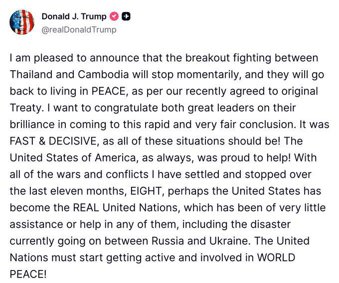 O presidente Trump declarou que os combates recentes entre Tailândia e Camboja serão suspensos temporariamente, e as nações retornarão à coexistência pacífica conforme o tratado original acordado.