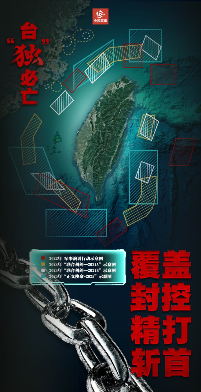 A China realizou exercícios militares ao redor de Taiwan de 2022 a 2025. Os mais recentes, "Missão Justiça - 2025", ocorreram em dezembro de 2025, a apenas 4,7 milhas náuticas (8,7 km) do território taiwanês.