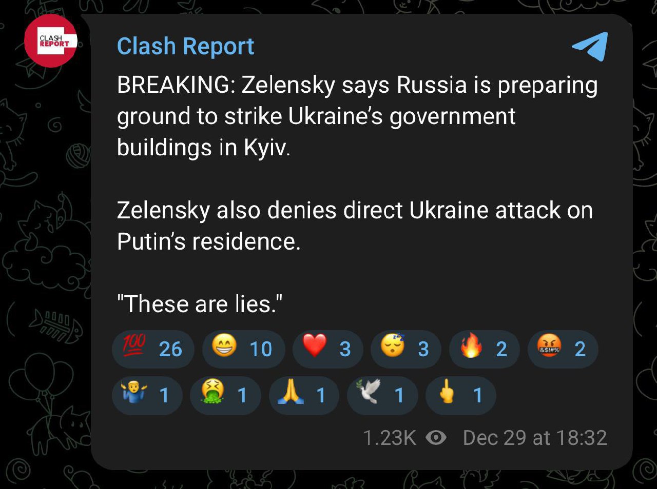 Zelensky nega relatos de um ataque ucraniano direto à residência de Putin, chamando de "mentira". Ele pediu que os EUA respondam adequadamente às ameaças russas.