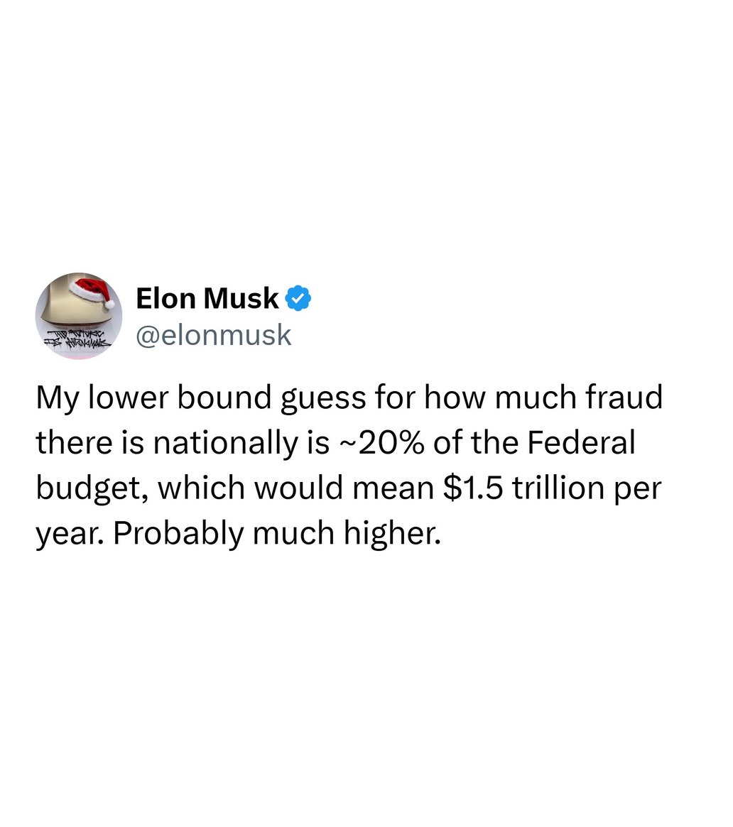 Elon Musk alerta que cerca de 20% do orçamento federal dos EUA, equivalente a US$ 1,5 trilhão, pode ser perdido anualmente por fraude.