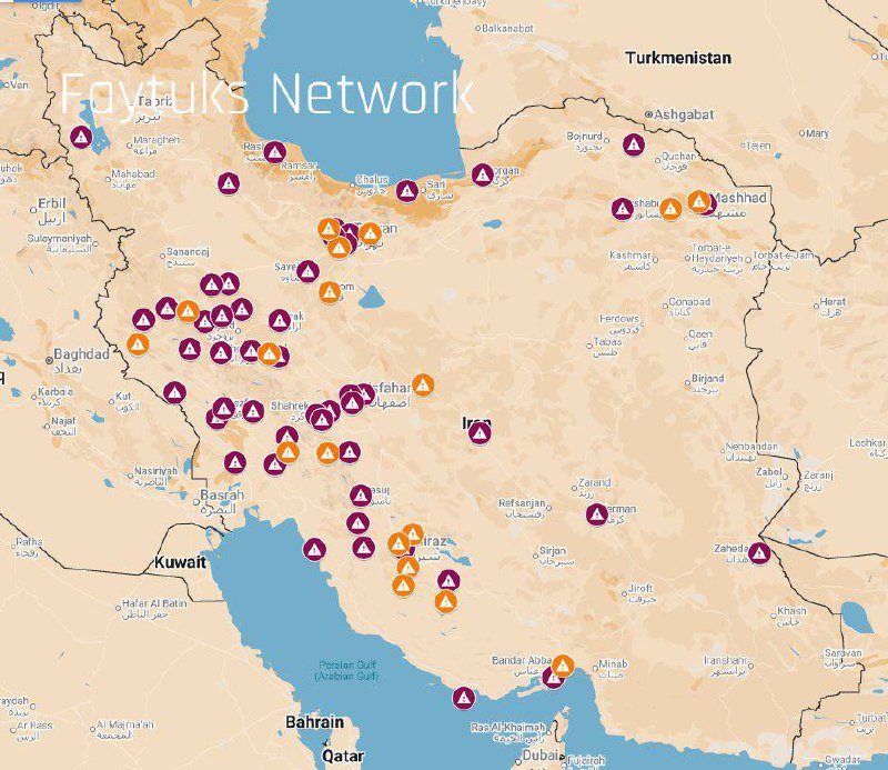 Mapa da Faytuks Network mostra protestos em todo o Irã. Marcadores vermelhos indicam protestos em andamento desde antes de 1º de janeiro de 2026; laranja, protestos iniciados em 1º de janeiro de 2026.